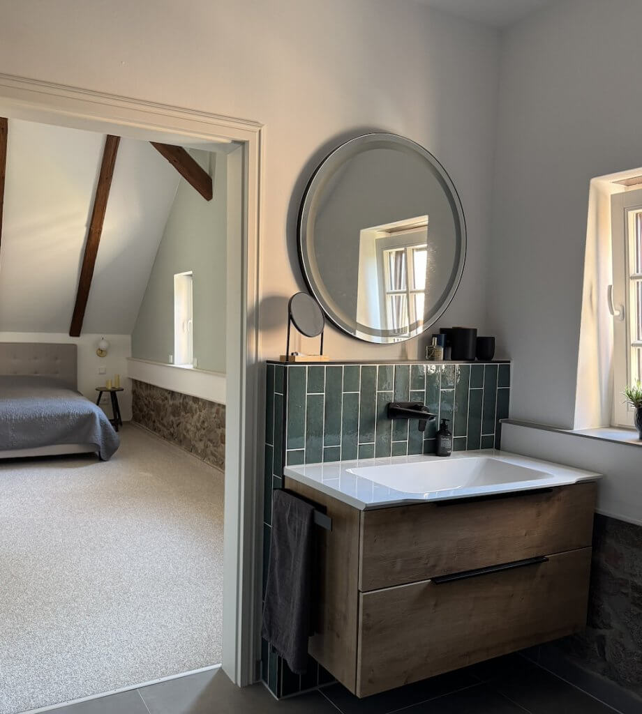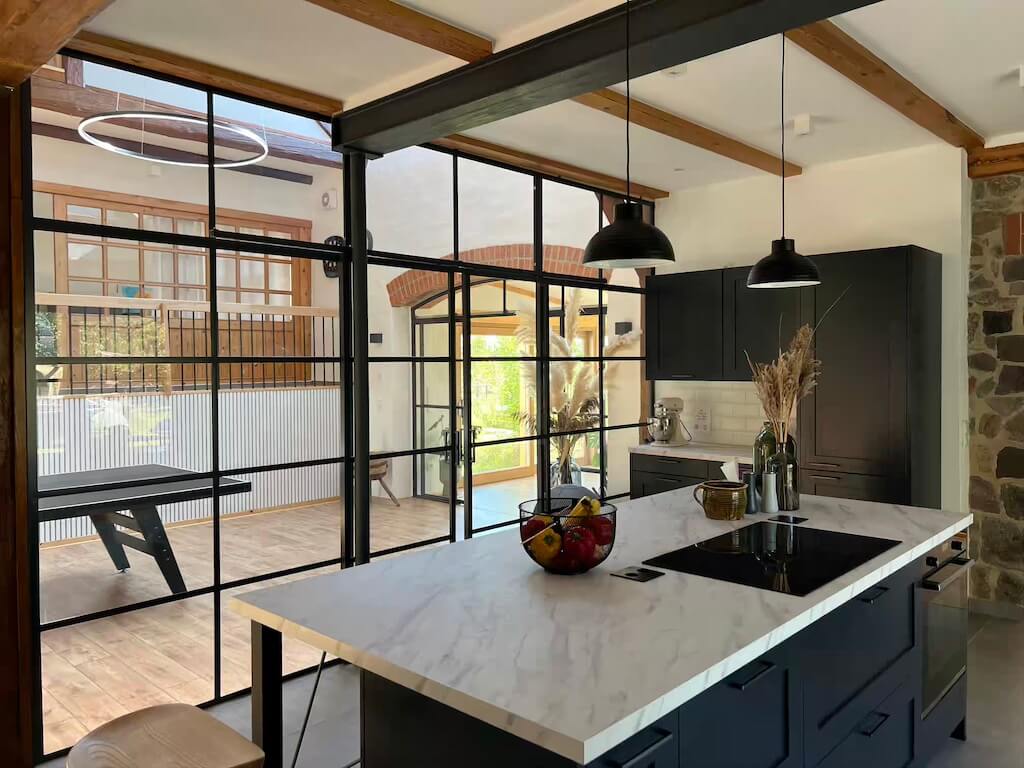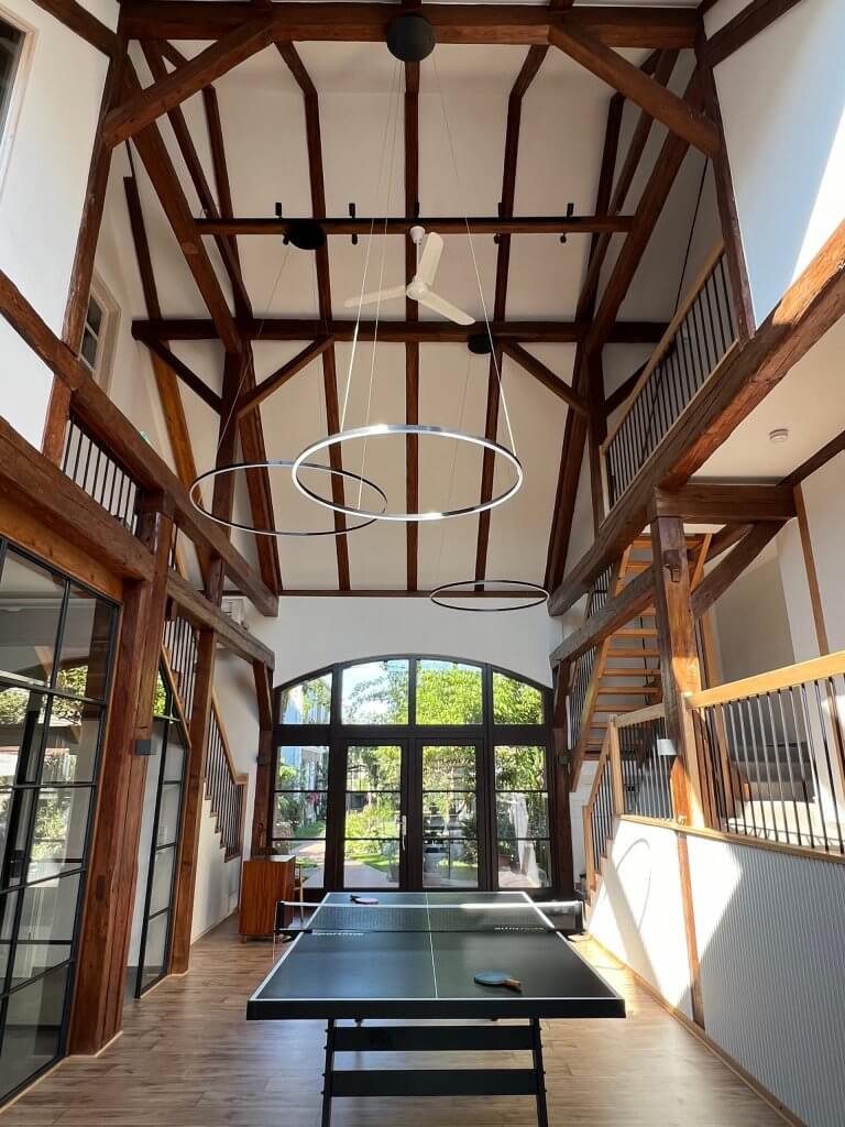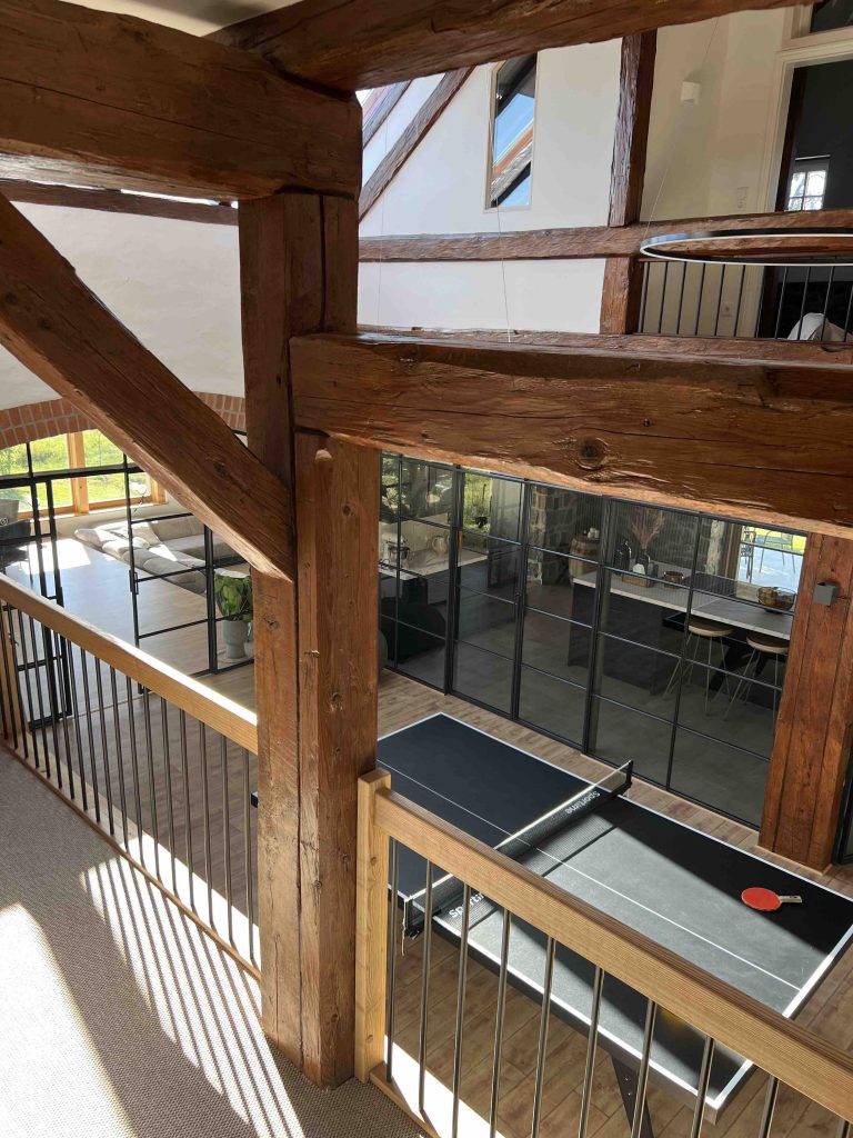 Es erwartet Sie eine harmonische Kombination aus traditionellen und modernen Materialien, eingebettet in die historische Scheunen-Architektur. Ein Highlight ist die imposante Tenne mit einer Raumhöhe von 8 Metern, die Verbindungselement zur großzügigen Küche, dem offenen Wohnbereich und allen Schlafzimmern ist. Ein wahrer Raum für mehr.